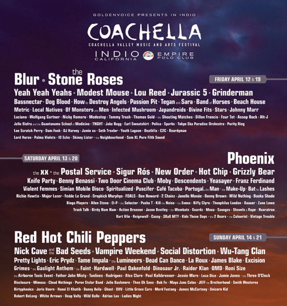 Compare this to the very first Coachella which featured, as The LA Times noted, “a bevy of artists who were picked more for their critical acclaim than for commercial success.”