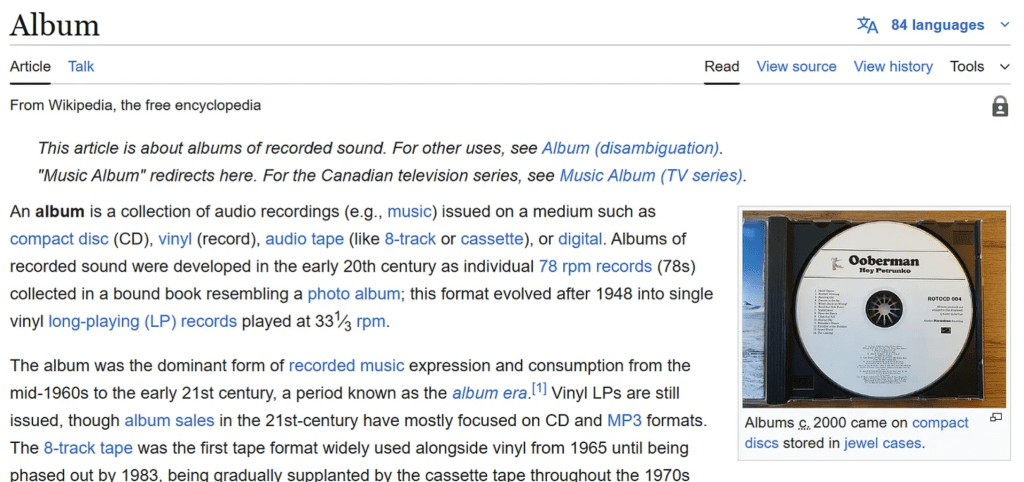 Granted, this is but one of a number of images used on Wikipedia’s entry on “the album”. Scroll down the page and you’ll also see a Thaikovsky 78, a picture of a vinyl LP, a “typical” 8-track tape player, a blank cassette tape, the CD of Led Zeppelin III, and a photo of an orchestra in a studio.